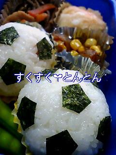 誰でも作れるサッカーボール海苔 でおにぎりd(゚∀゚;)・゚∵ ドラえもんのゆで卵の形で真ん中に昆布を入れて海苔を巻いただけ~! 海苔を切らないってステキ☆ 時間短縮 寝坊した日はサッカーボールだね(^_) ↑寝坊してないけど 海苔カット*簡単サッカーボールおにぎり♪の作り方 以前おにぎりのお弁当を紹介した時、 『あの海苔はどこで買えますか?』、『作り方はどうやって?』 と言うご質問を頂いたので紹介させていただきます。 市販の物もありますが、大きさが合わない、10枚もいらない・・・ と言う時サッカーボールおにぎりには私も苦労しました。 まず、5角形に切るところからしてキーーーッ! 市販のサッカーボール海苔は白黒が逆転してて抵抗があったし。 で、2度目からはキティやらクマさんのふりかけとか、超ミニ三角おにぎりに逃げた。